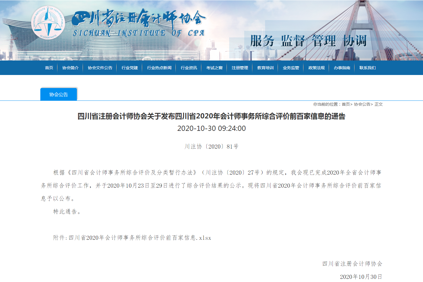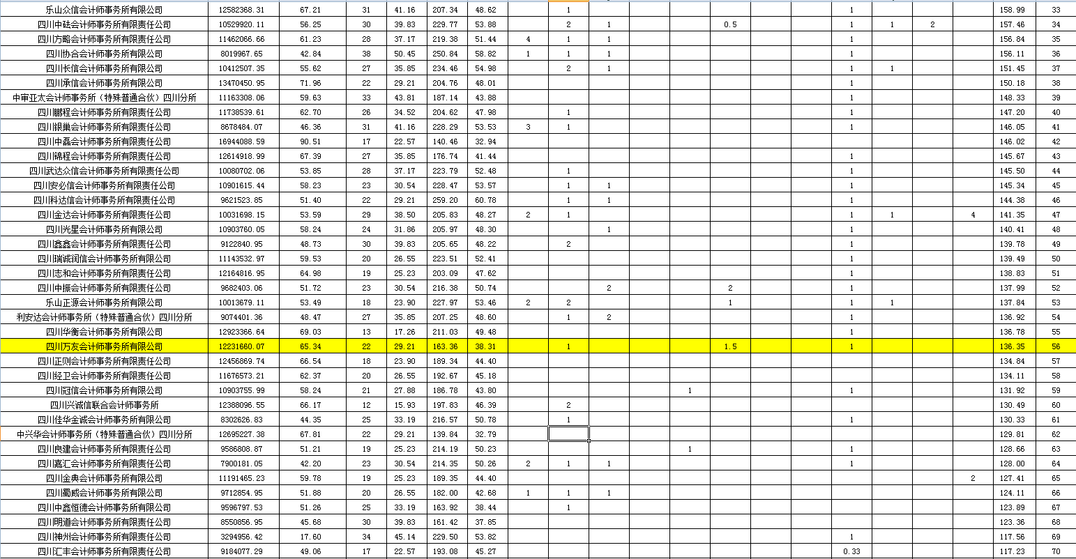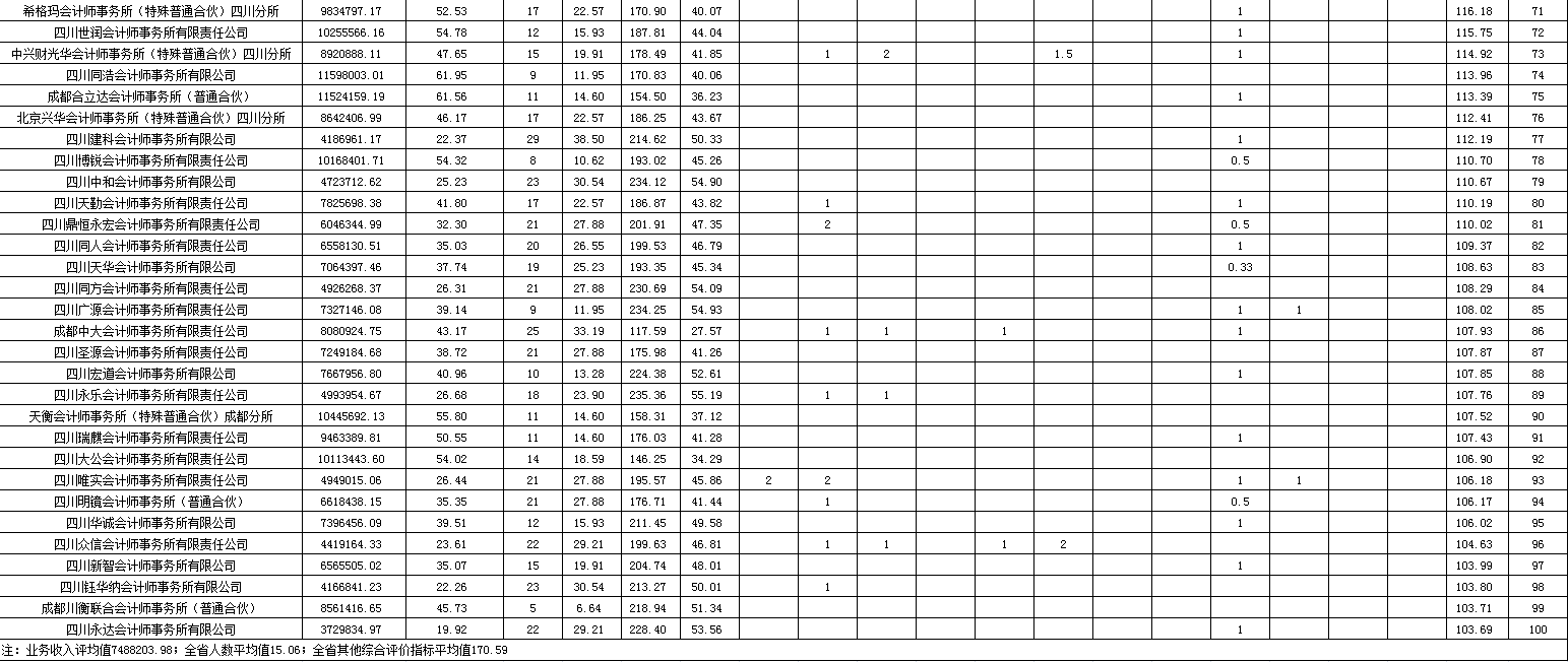 2020年10月,本所在四川省注册会计师协会发布四川省2020年会计师事务所综合评价前百家信息的通告中位列第56名