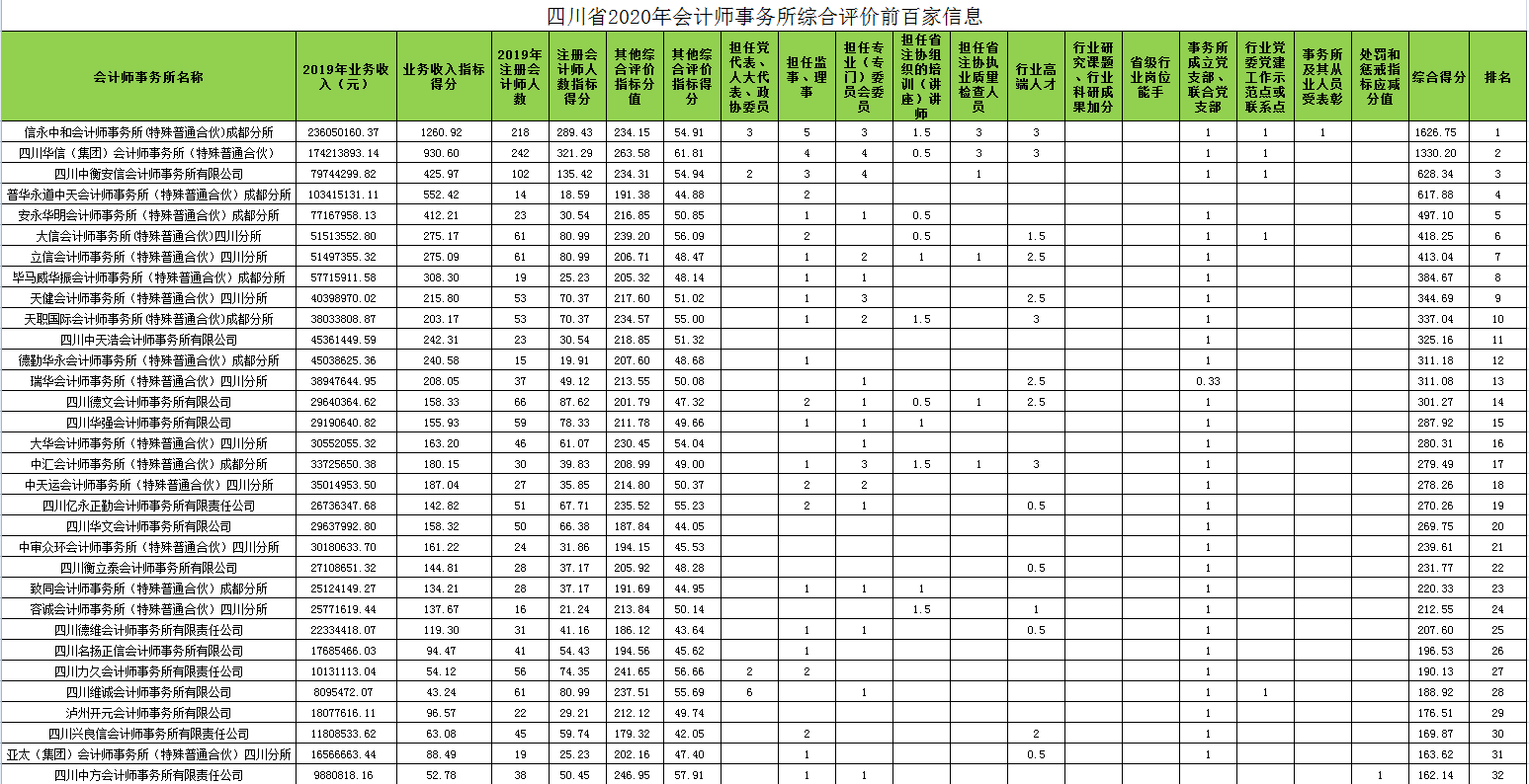 2020年10月,本所在四川省注册会计师协会发布四川省2020年会计师事务所综合评价前百家信息的通告中位列第56名