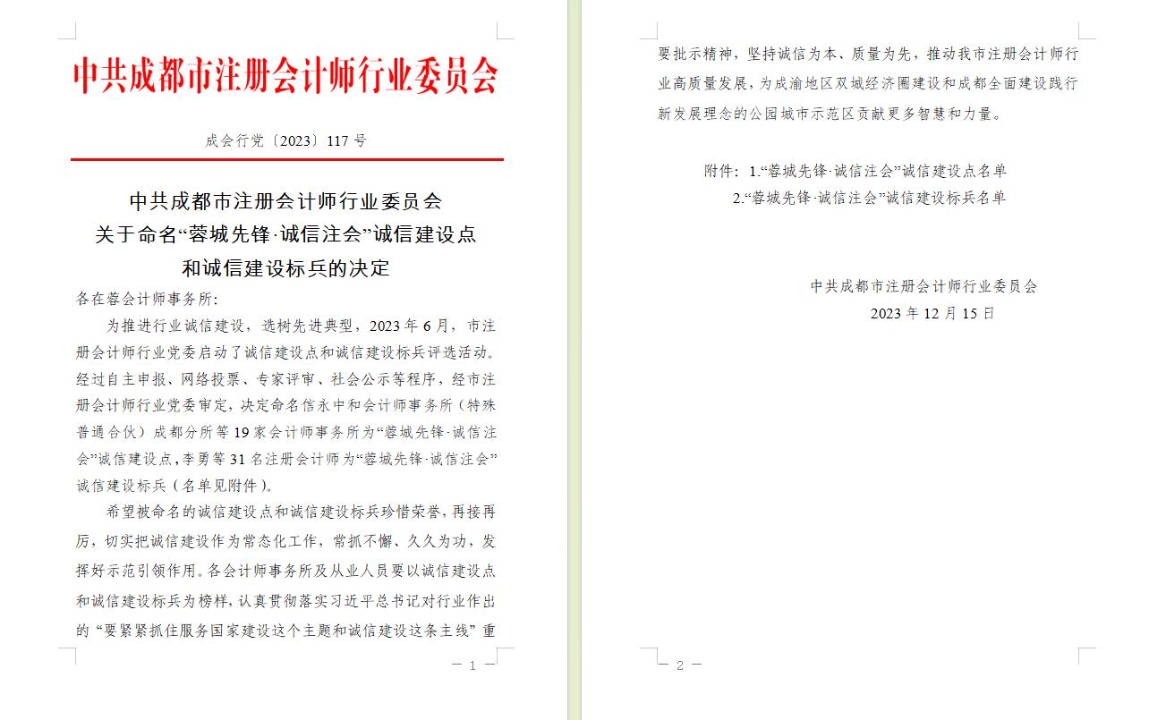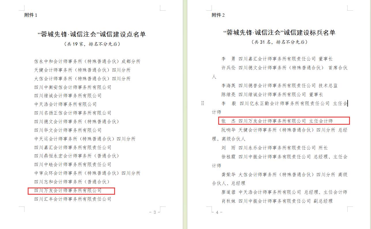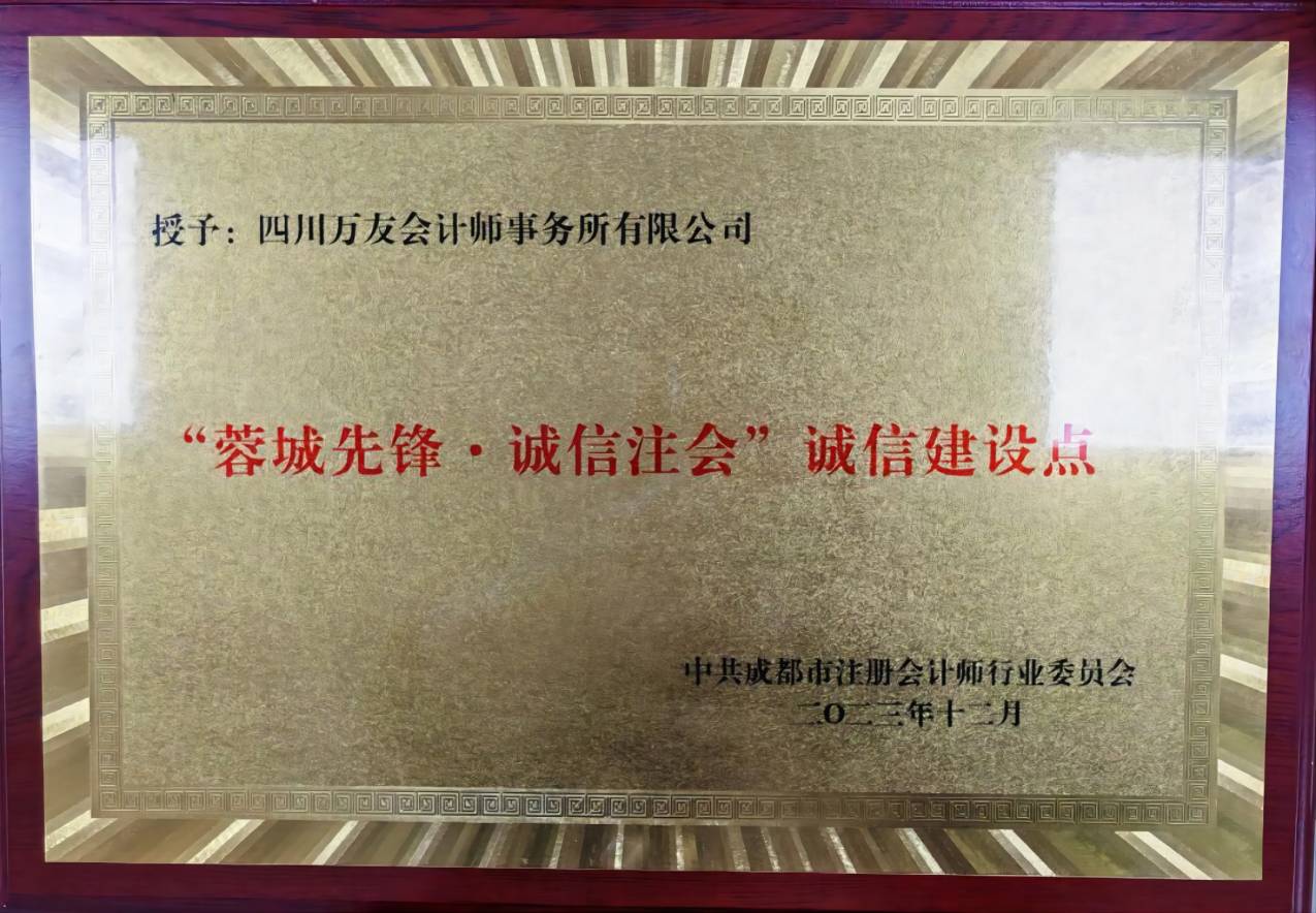 2023年12月,我四川万友会计师事务所和主任会计师张杰被中共成都市注册会计师行业委员会分别命名为“蓉城先锋·诚信注会”诚信建设点和“蓉城先锋·诚信注会”诚信建设标兵