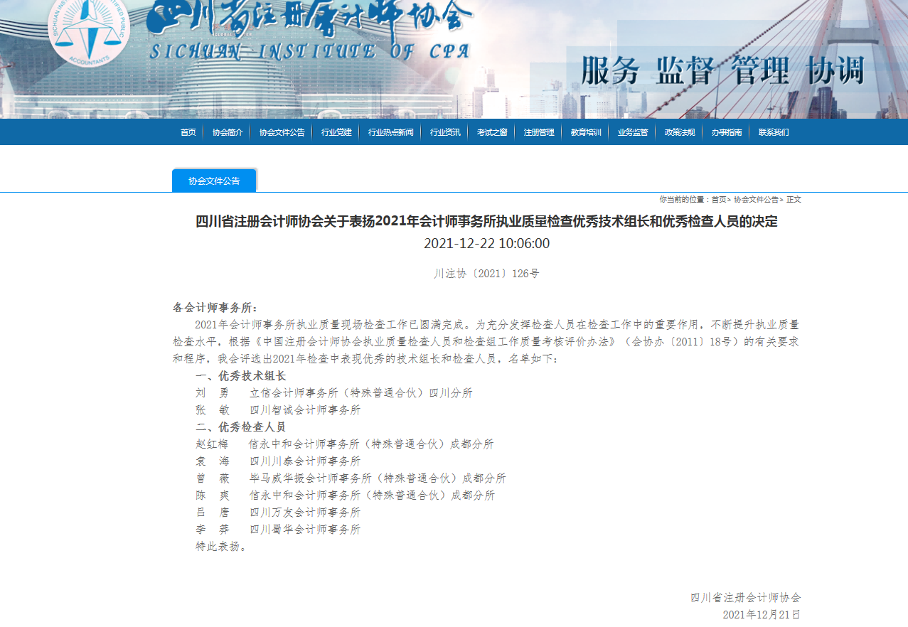 我所注册会计师吕唐被四川省注册会计师协会评为2021年会计师事务所执业质量检查优秀检查人员