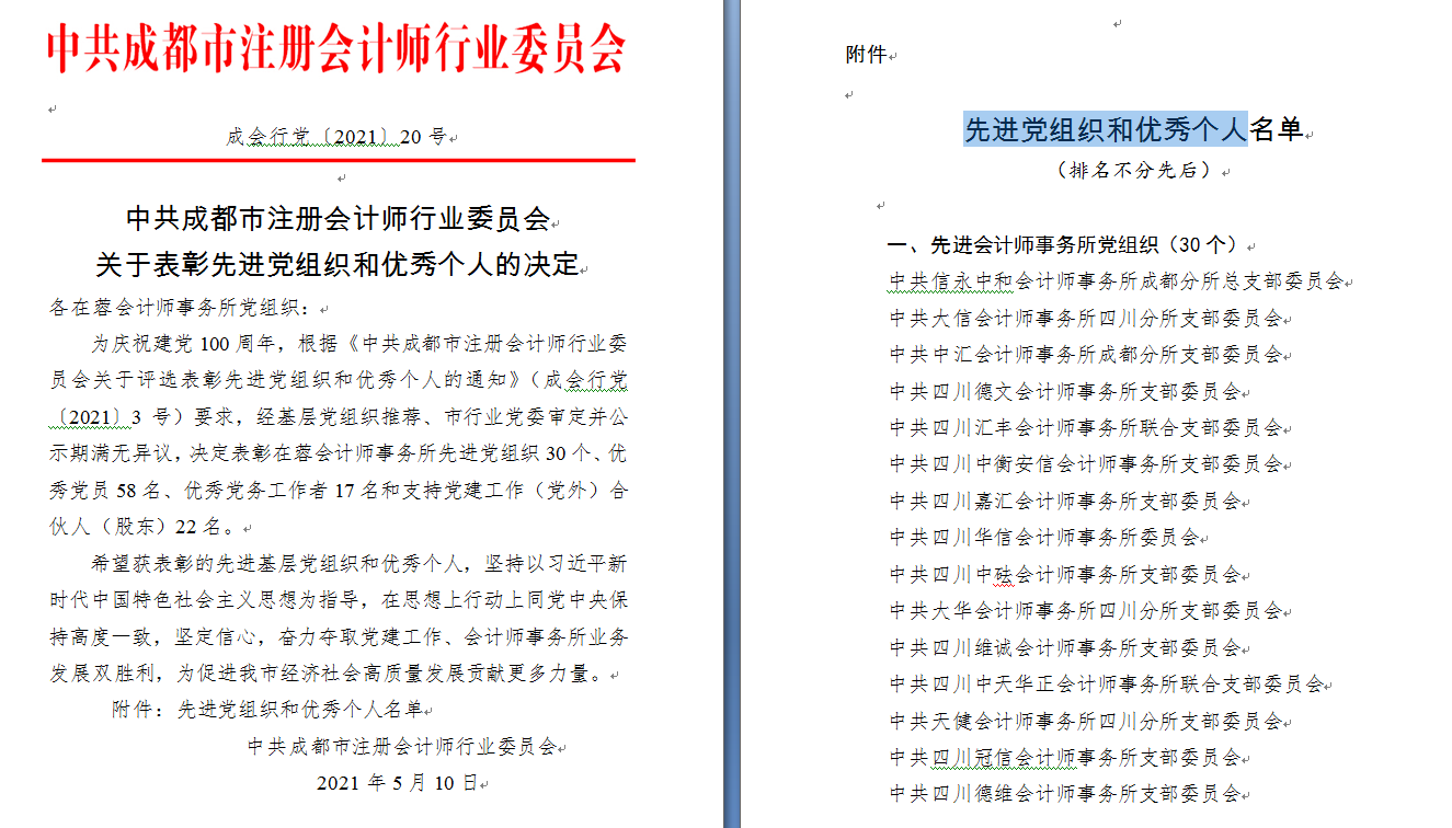 2021-06-232021年5月,中共四川万友会计师事务所支部委员会及共产党员张杰被中共成都市注册会计师行业委员会评为先进党组织和优秀个人
