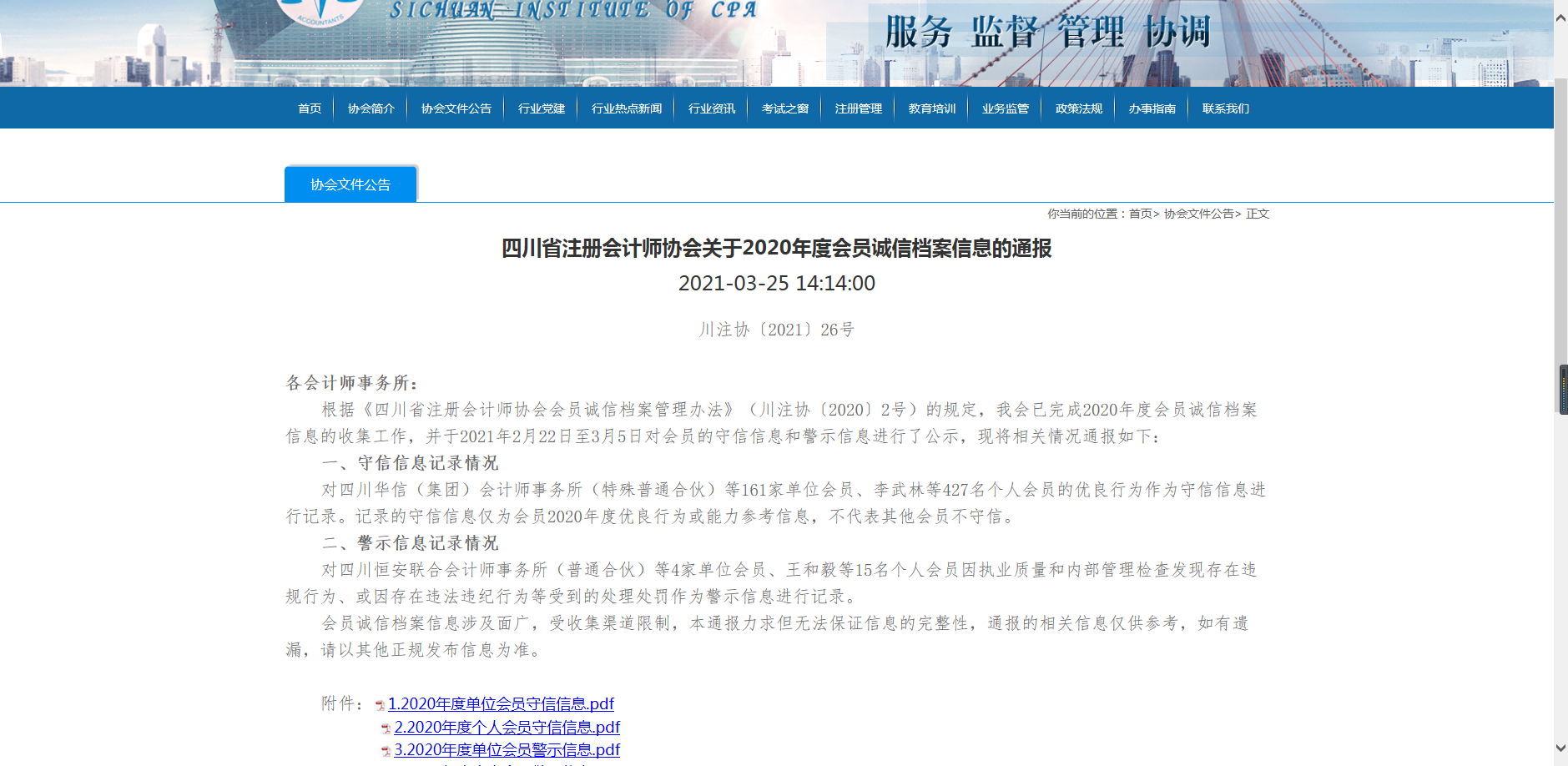 四川省注册会计师协会关于2021年度会员诚信档案信息的公示