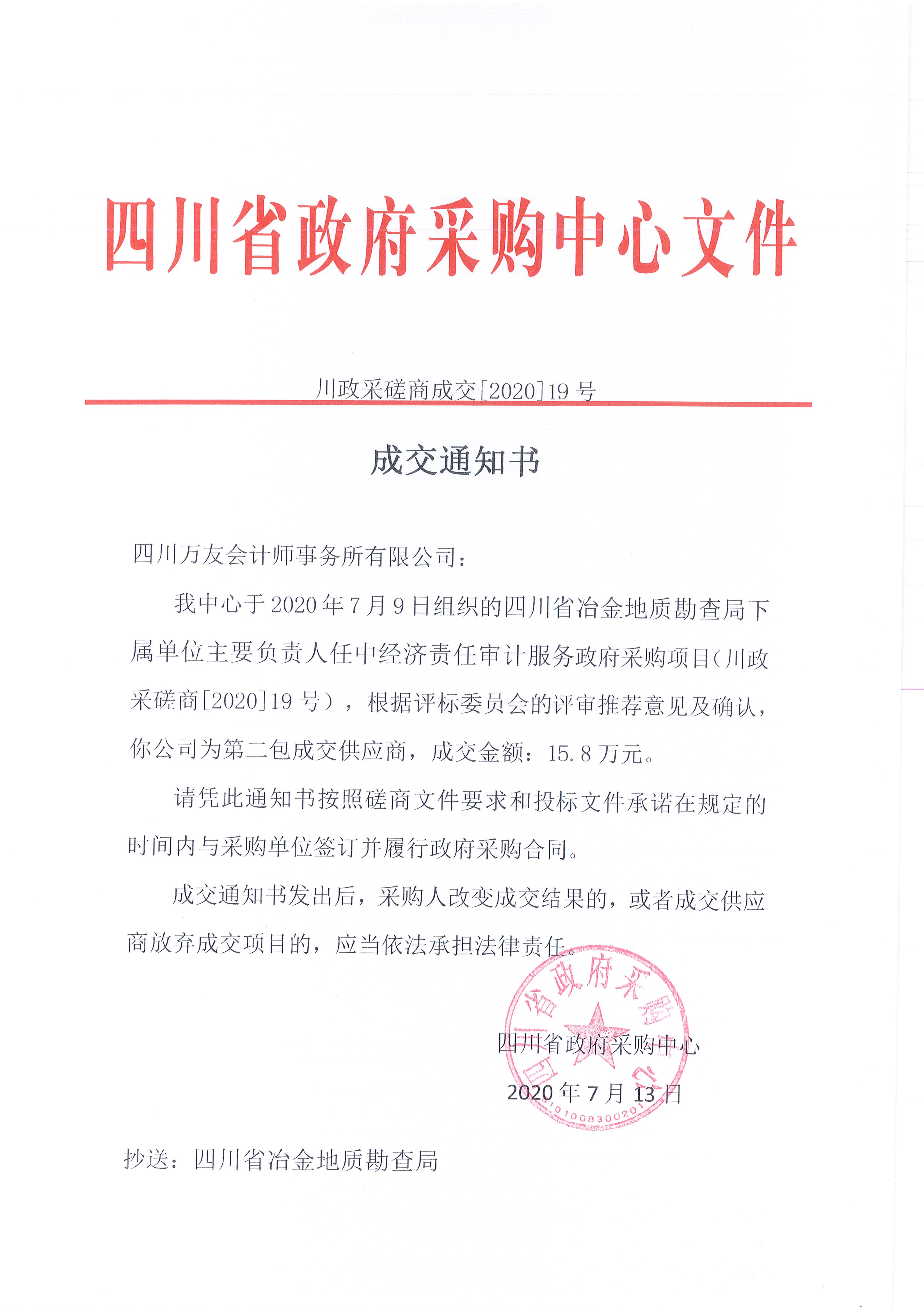2020年7月13日,四川万友会计师事务所有限公司中标四川省政府采购中心组织的四川省冶金地质勘查局下属单位主要负责人任中经济责任审计服务项目(川政采磋商〔2020〕19号)