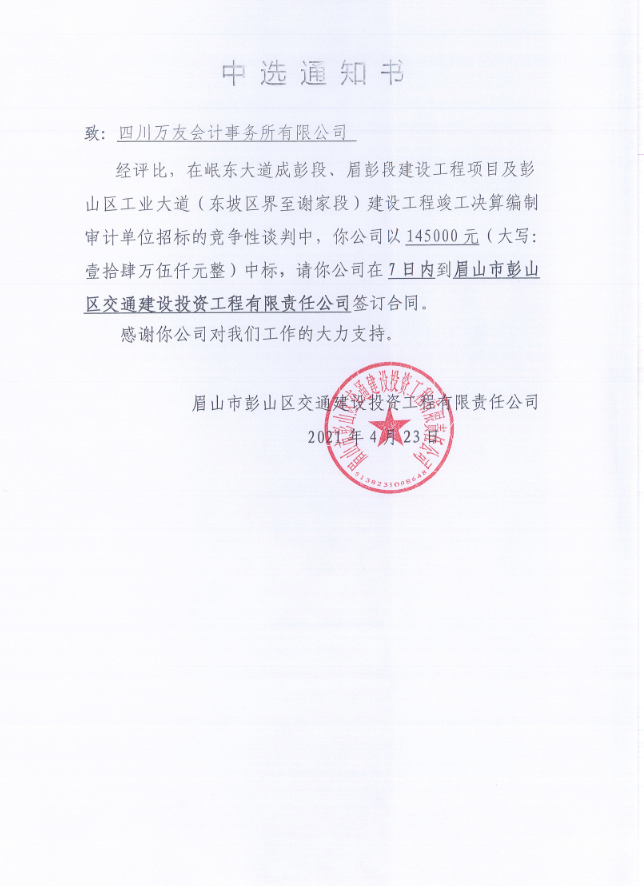 2021年4月,我公司中标眉山市彭山区交通建设投资工程有限责任公司竣工决算审计项目